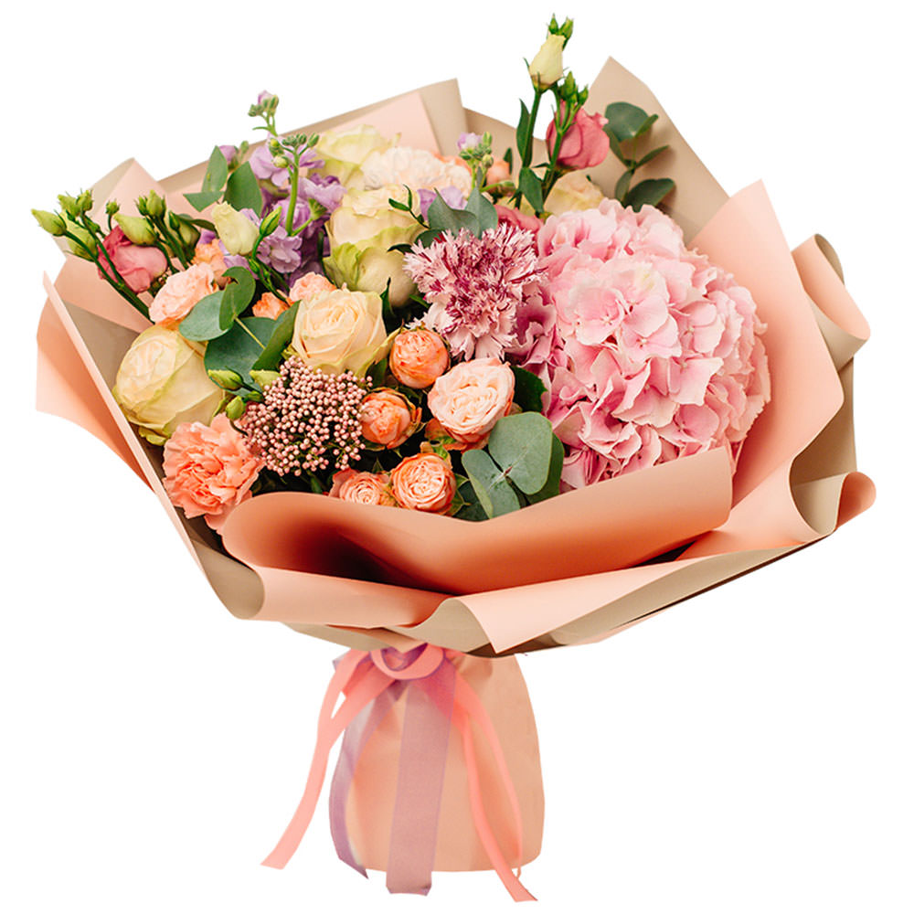 Гортензия, гвоздика, роза пионовидная кустовая, роза одноголовая, гипсофилы, эустомы, зелень эвкалипт, матиола.