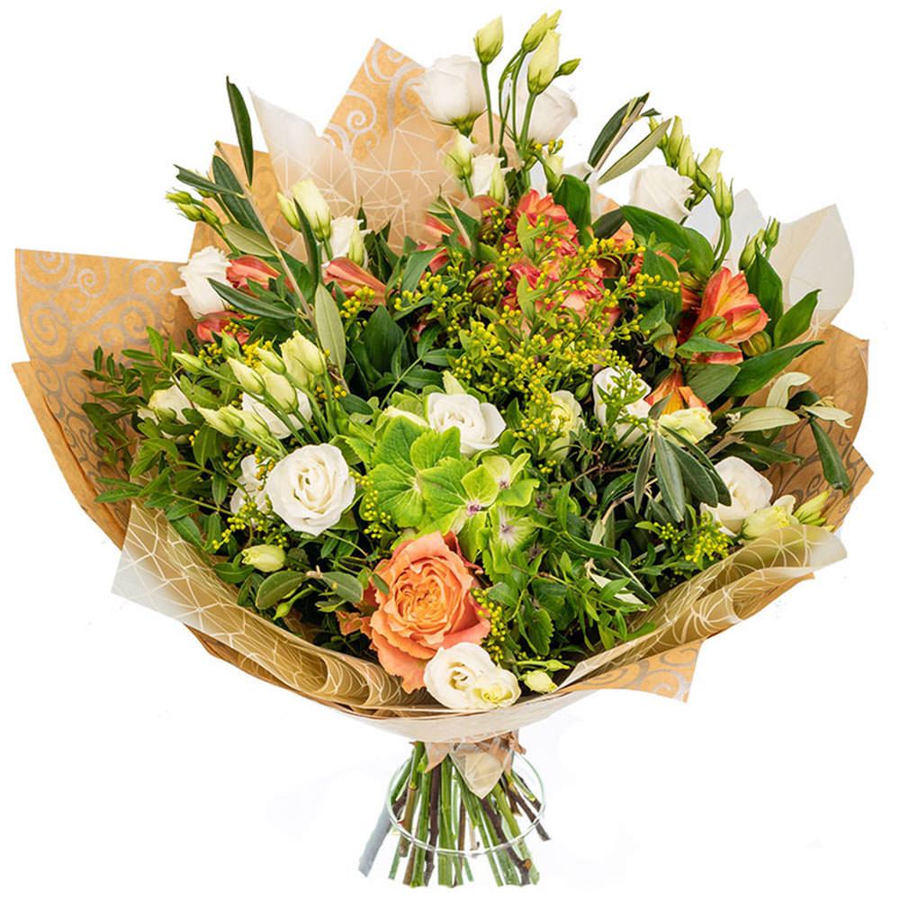 Роза пионовидная, эустома, альстромерия, фисташка, прочая зелень.