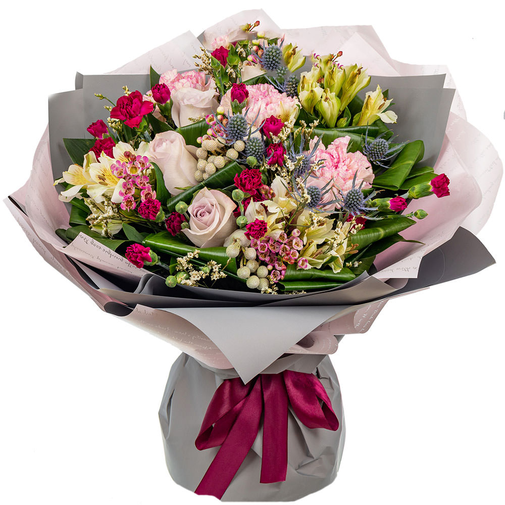 Роза одноголовая, эрингиум, гвоздика, альстромерия, салал, хамелациум, бруния.